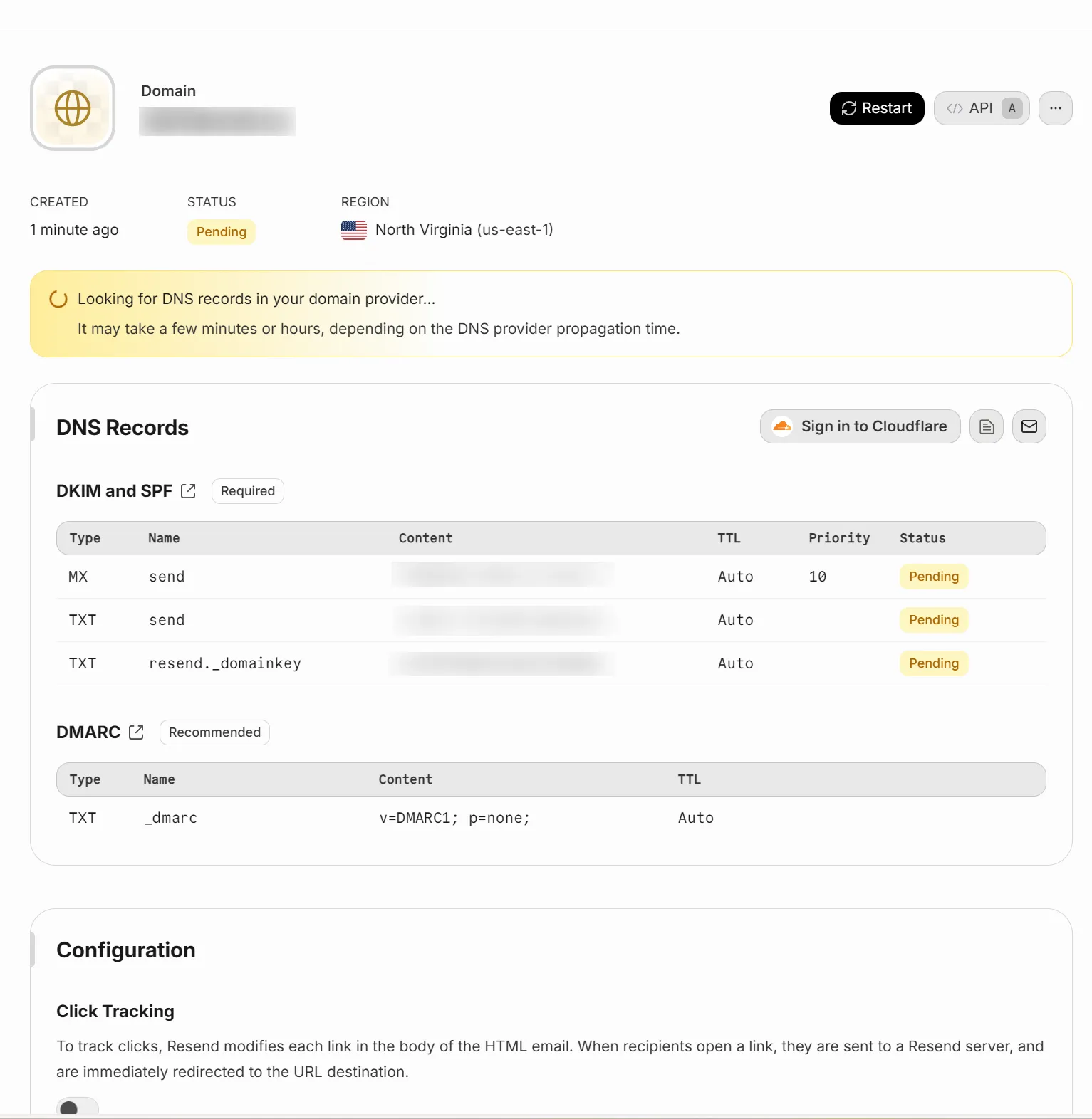 发送邮件的能力我们采用Resend 服务。首先需要注册Resend 服务,然后在Resend 服务中添加域名,如果你的域名刚好是在cloudflare 上管理的,那么通过授权给Resend ,Resend 会自动在cloudfalre 上添加相关域名配置。