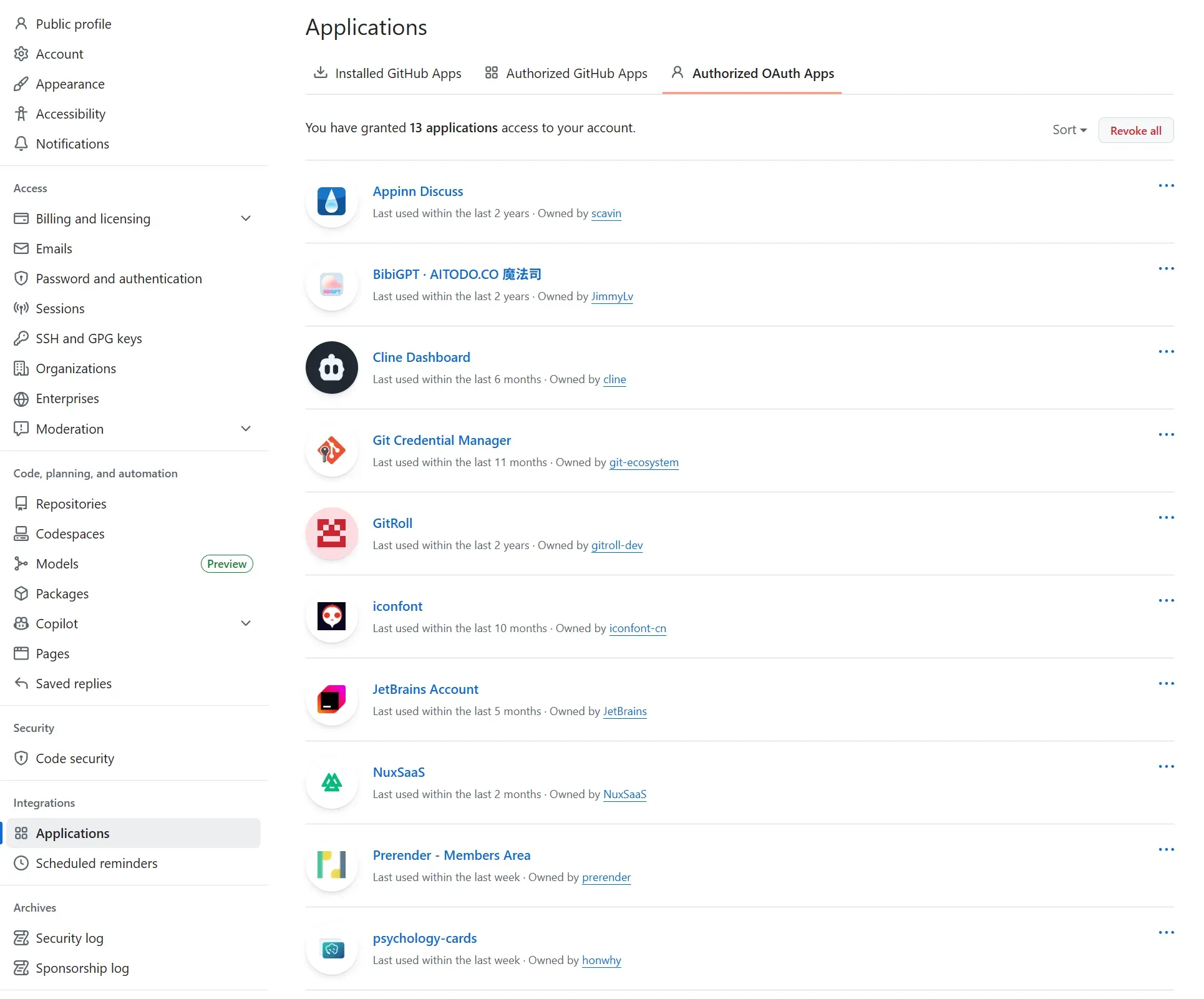 调试过程中可能需要反复进行授权和撤销授权,可通过此地址管理:https://github.com/settings/applications